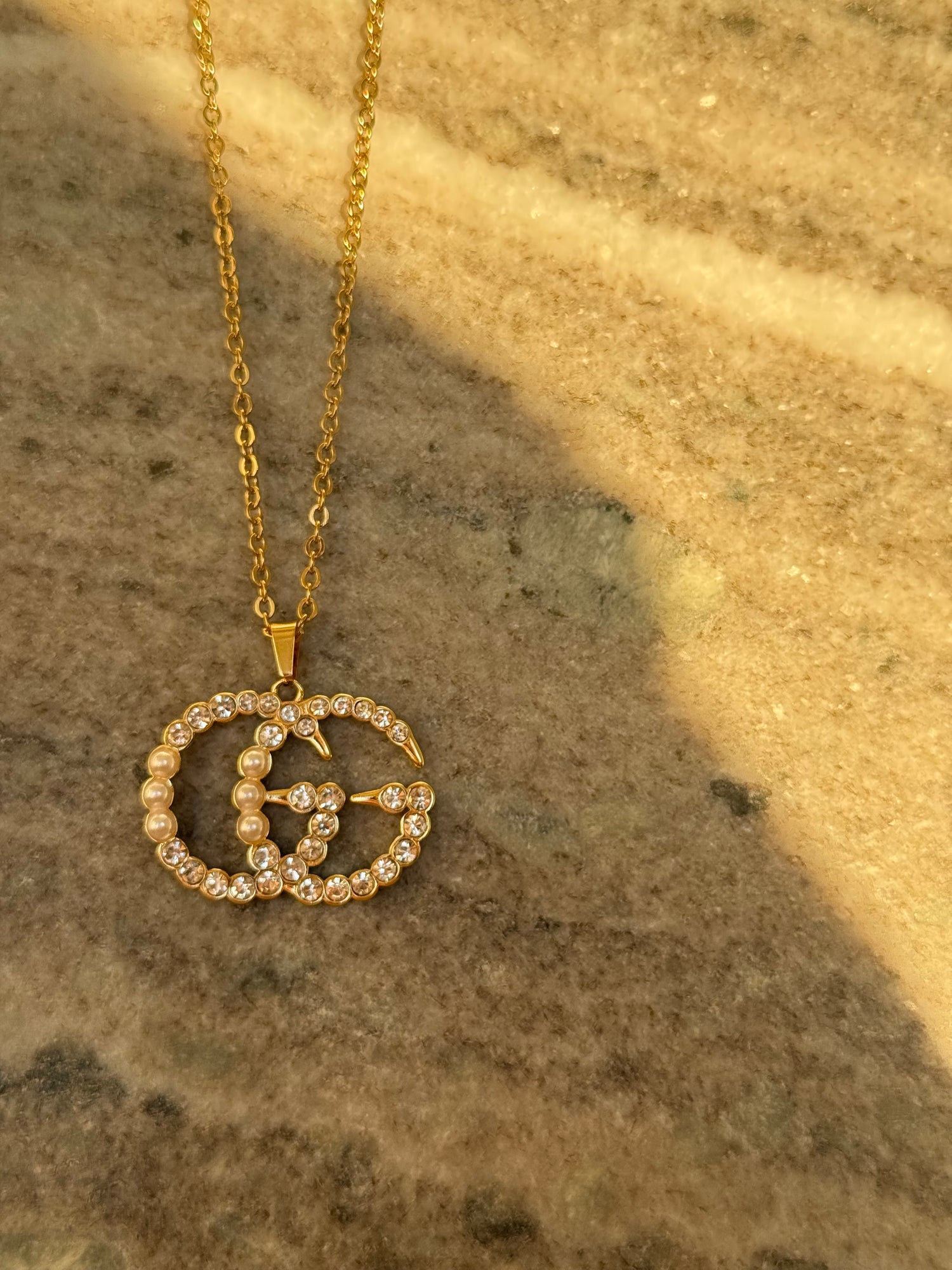 This vintage Gucci pendant is insanely rare—a gold GG logo dripping in vibrant crystals & pearls that catch light from every angle. It’s the first one I’ve ever found in over 4 years!