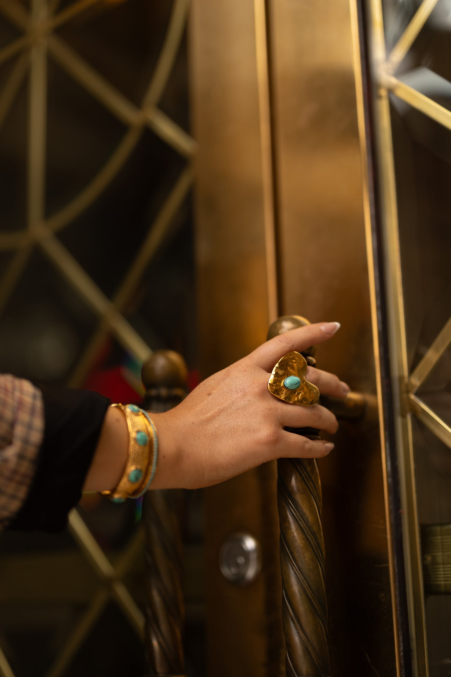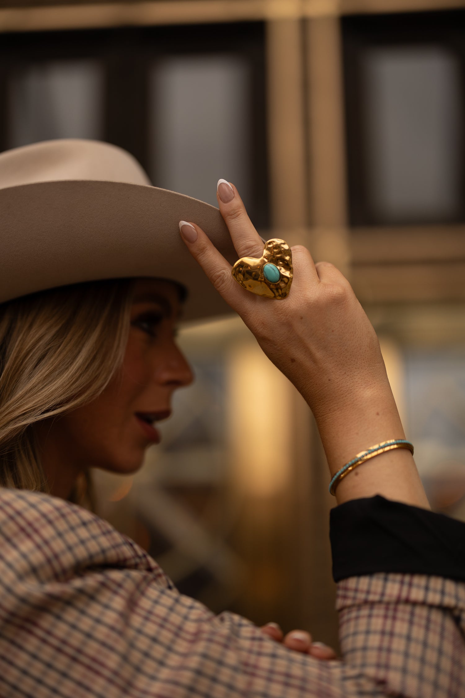 This gold hammered heart ring includes a vibrant turquoise center that truly adds that cowgirl charm!