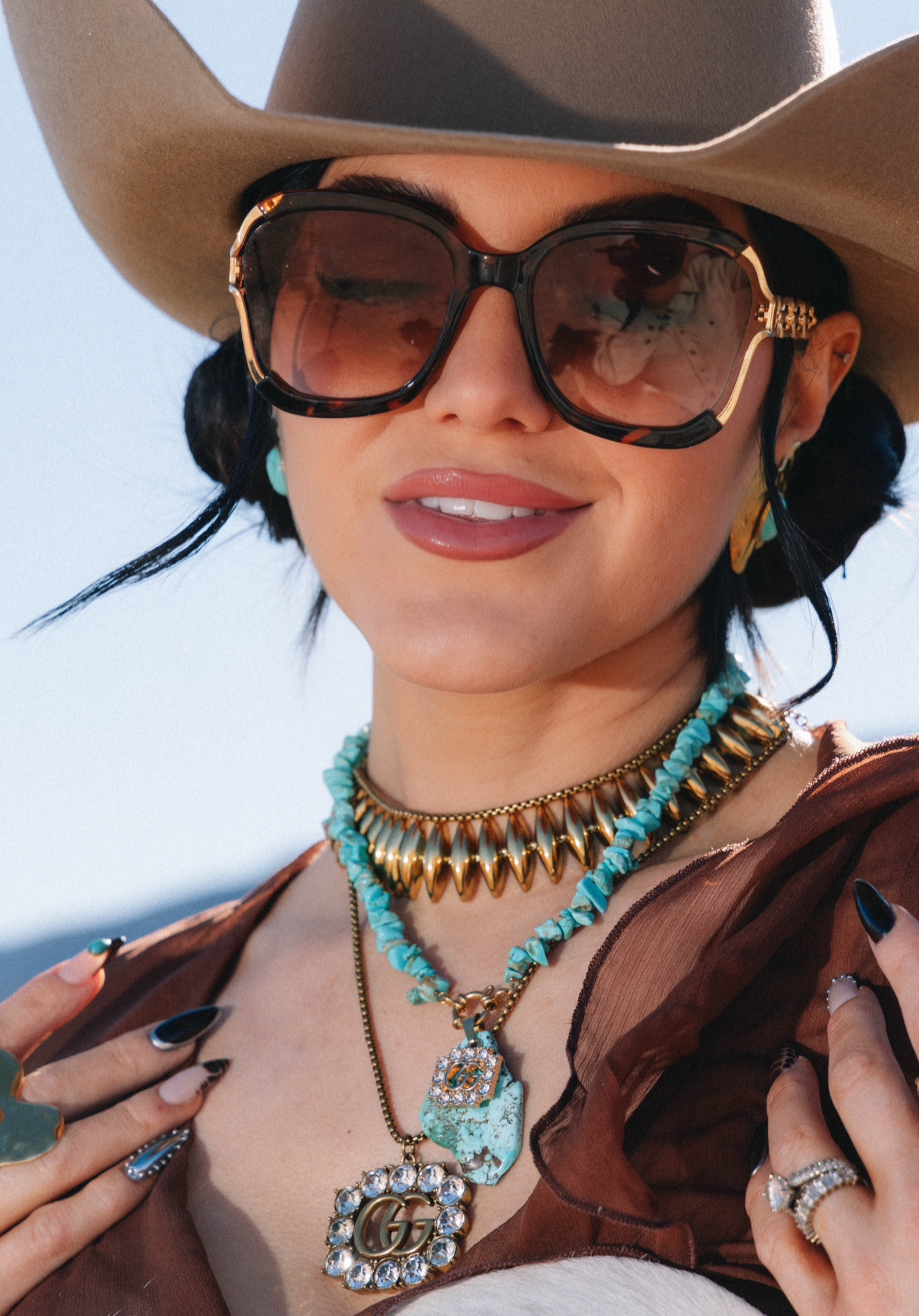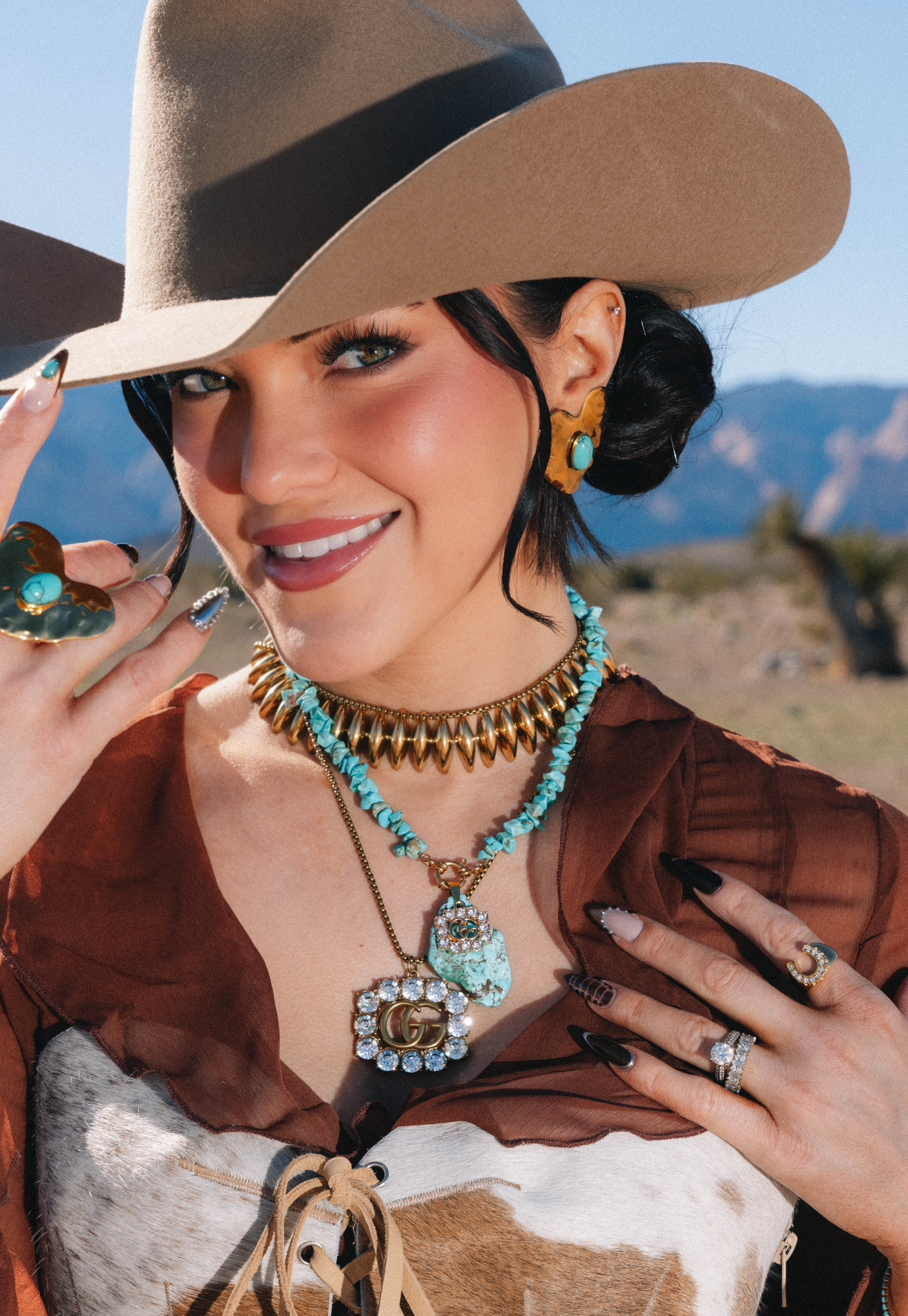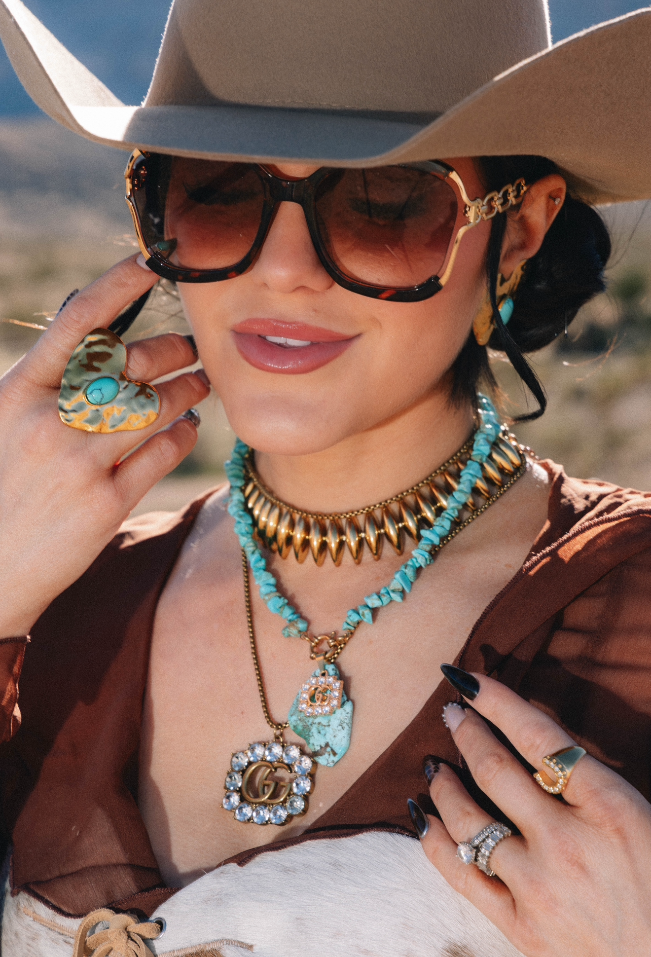 this piece features a full turquoise chip chain paired with a turquoise pendant with a authentic Gucci zipper pole layered on top. These pieces are extremely limited due to the rarity of the stone cut like this and the vintage piece paired with it. All of the turquoise is Genuine turquoise. Handcrafted By Allie. There are only four of these. That will ever exist. Each turquoise stone looks a little bit different but they all are beautiful and paired with the same turquoise chip necklace. All gold detailing pieces on this are 18 karat gold filled. The pendant is removable, and you can wear just the chip necklace on its own if you want!