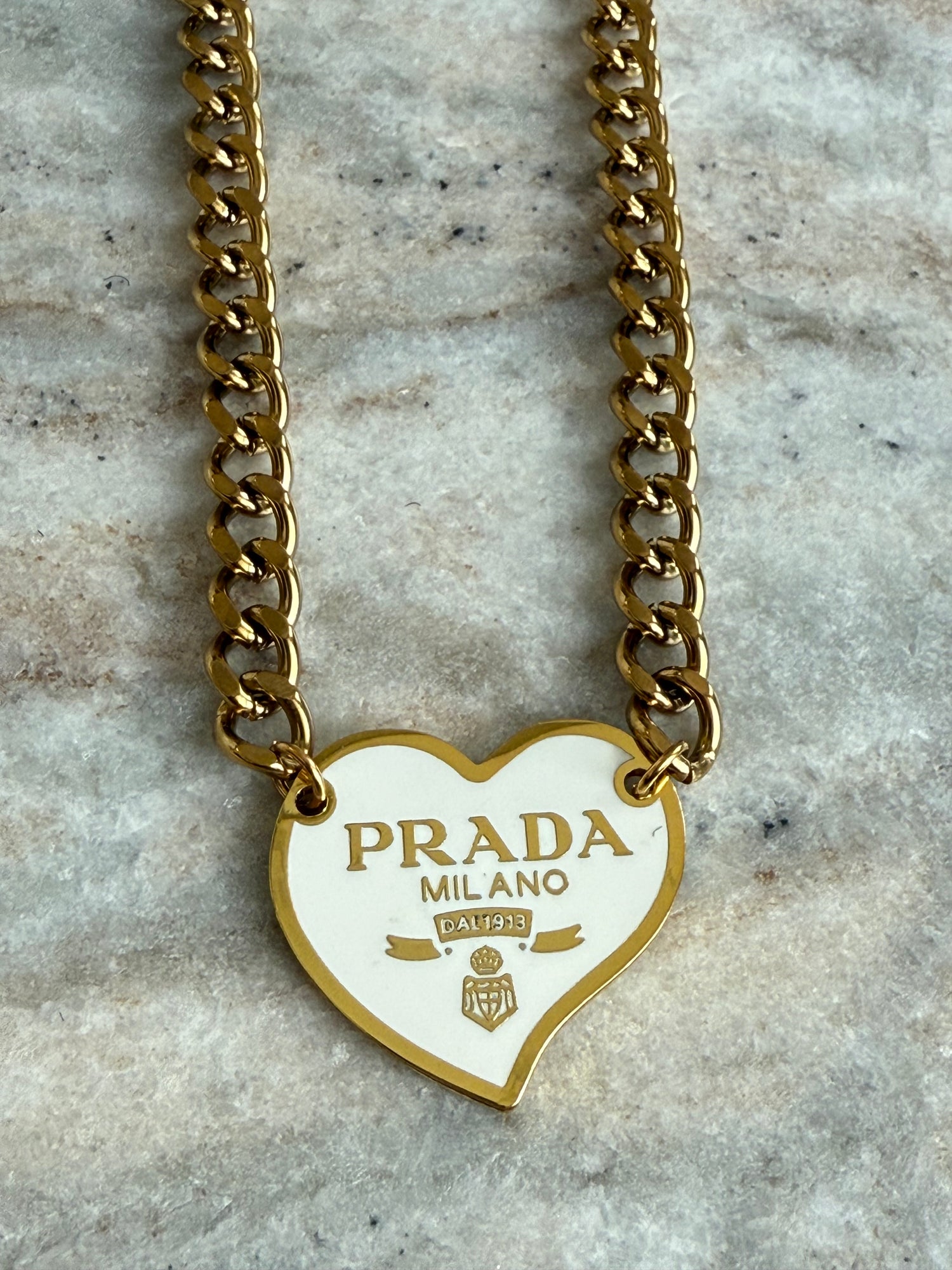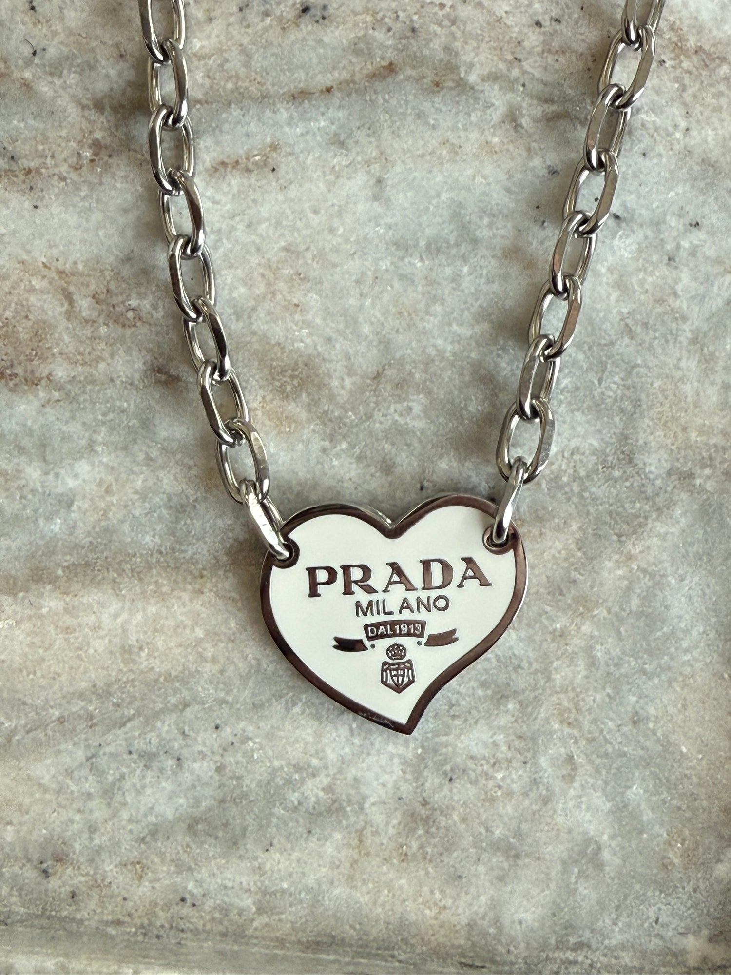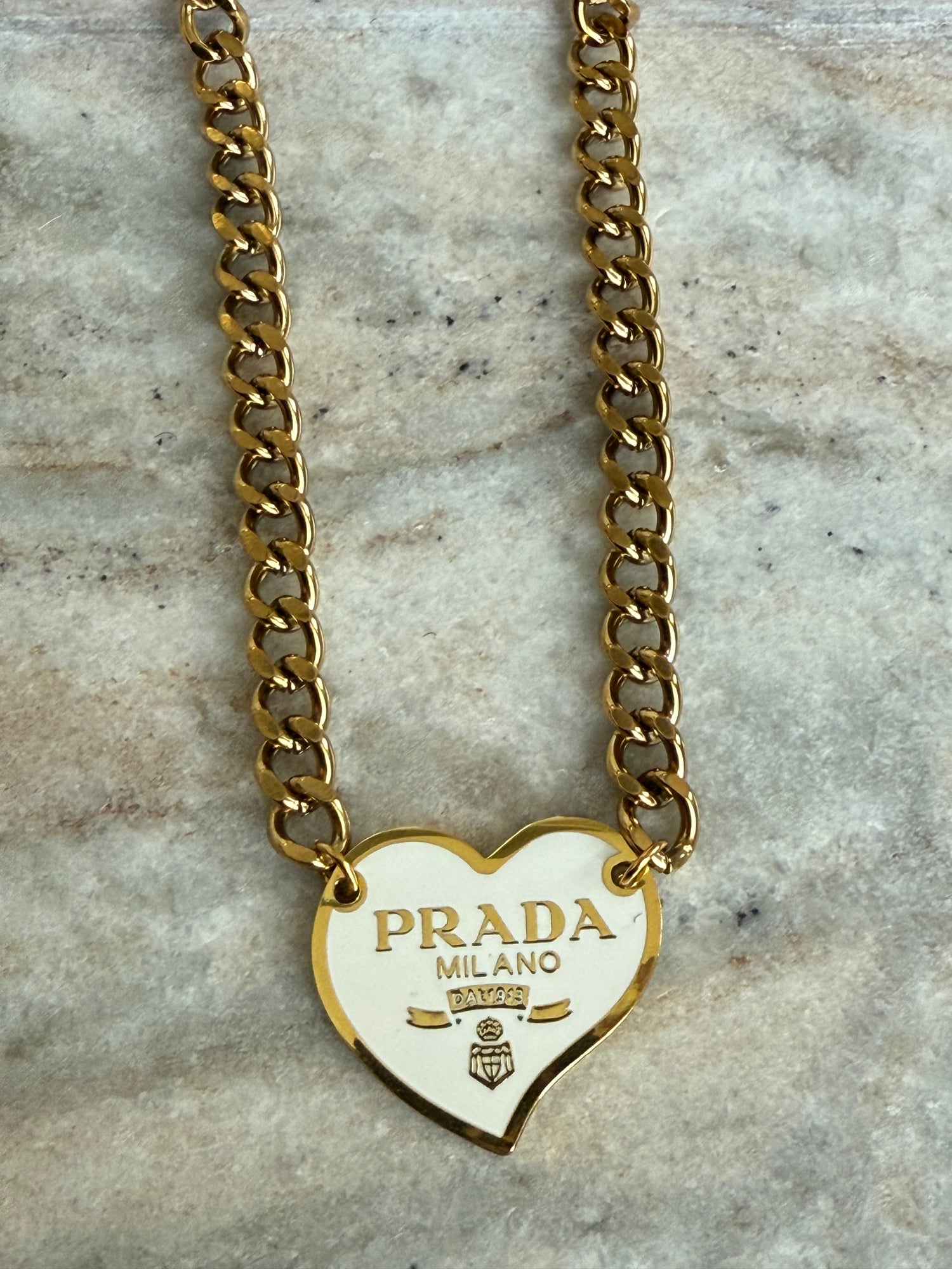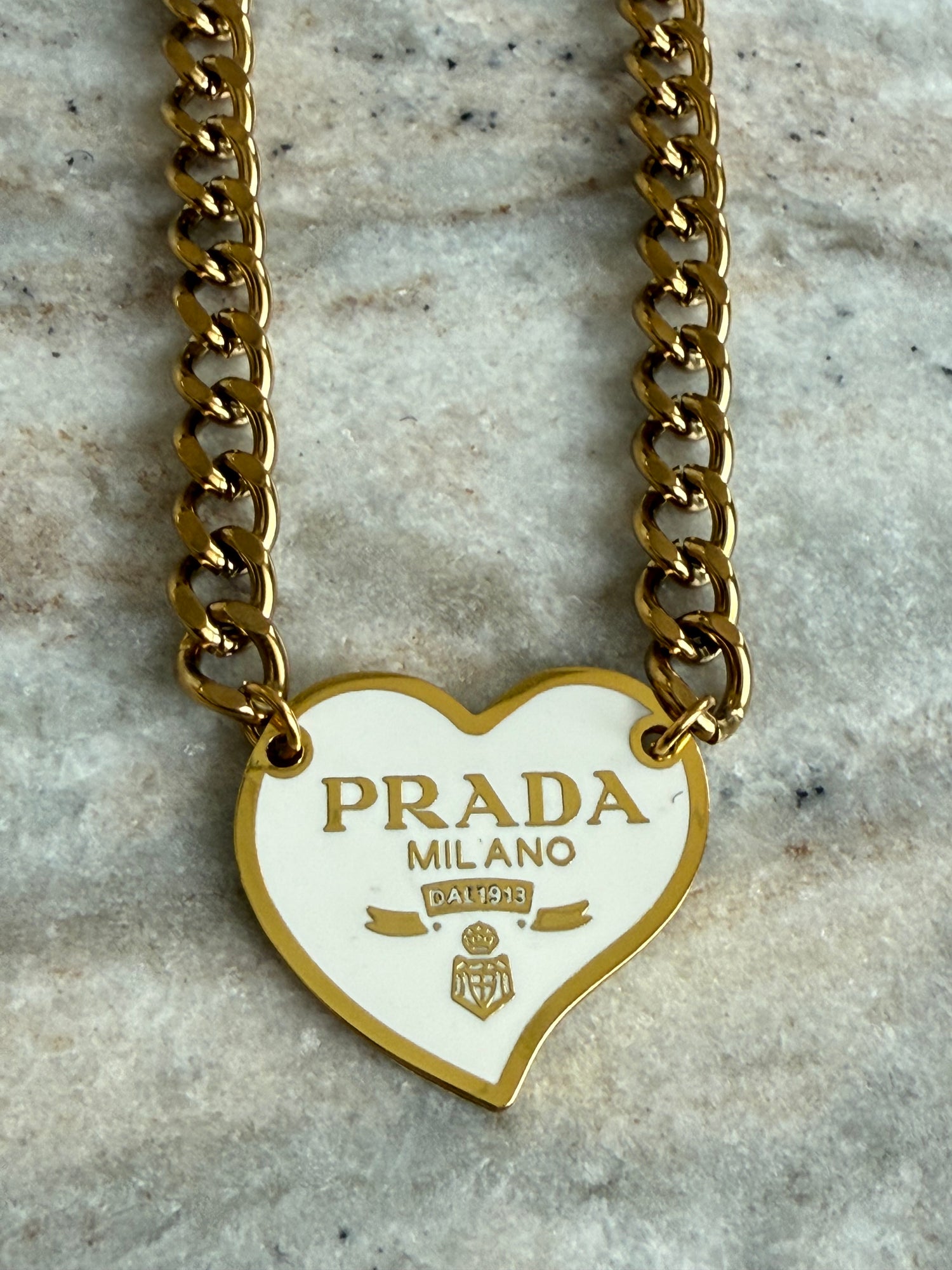 You’re looking at a piece we’ll probably never find again. This vintage Prada pendant was sourced from a rare drop and repurposed onto a non-tarnish 18k gold-filled chain that levels up everything.