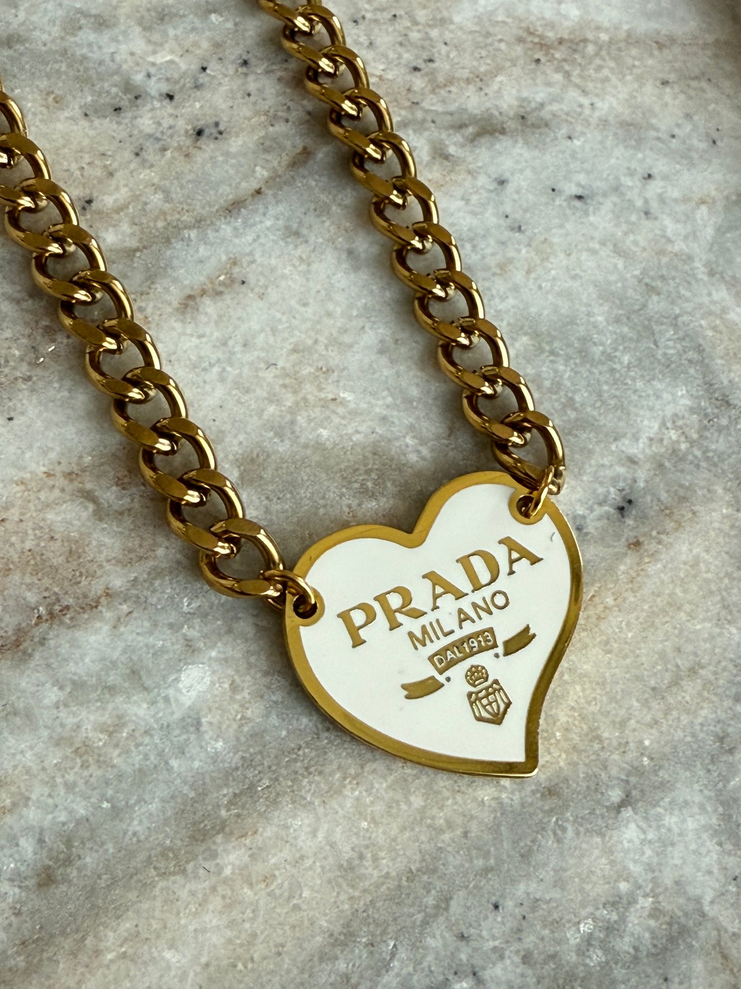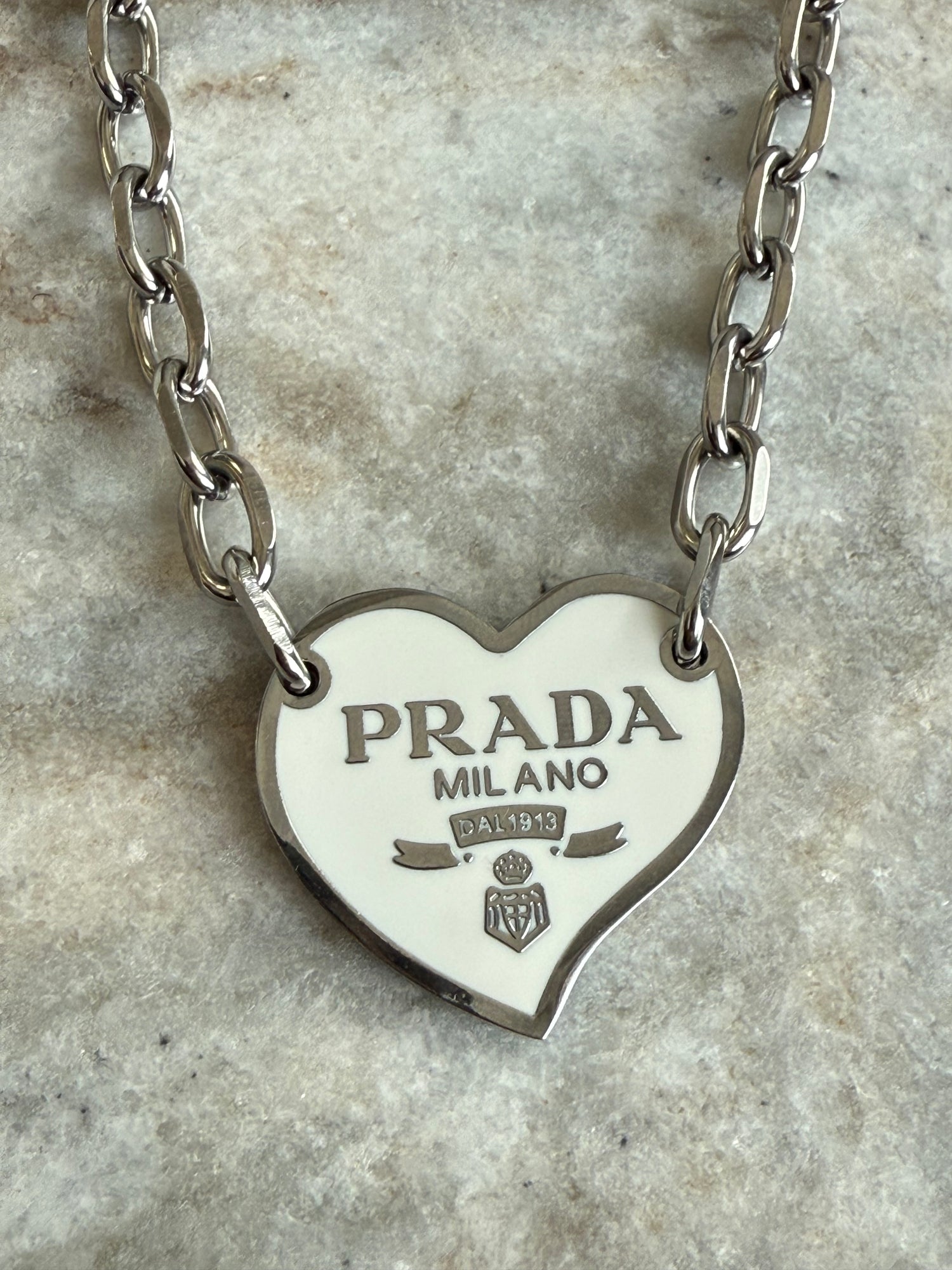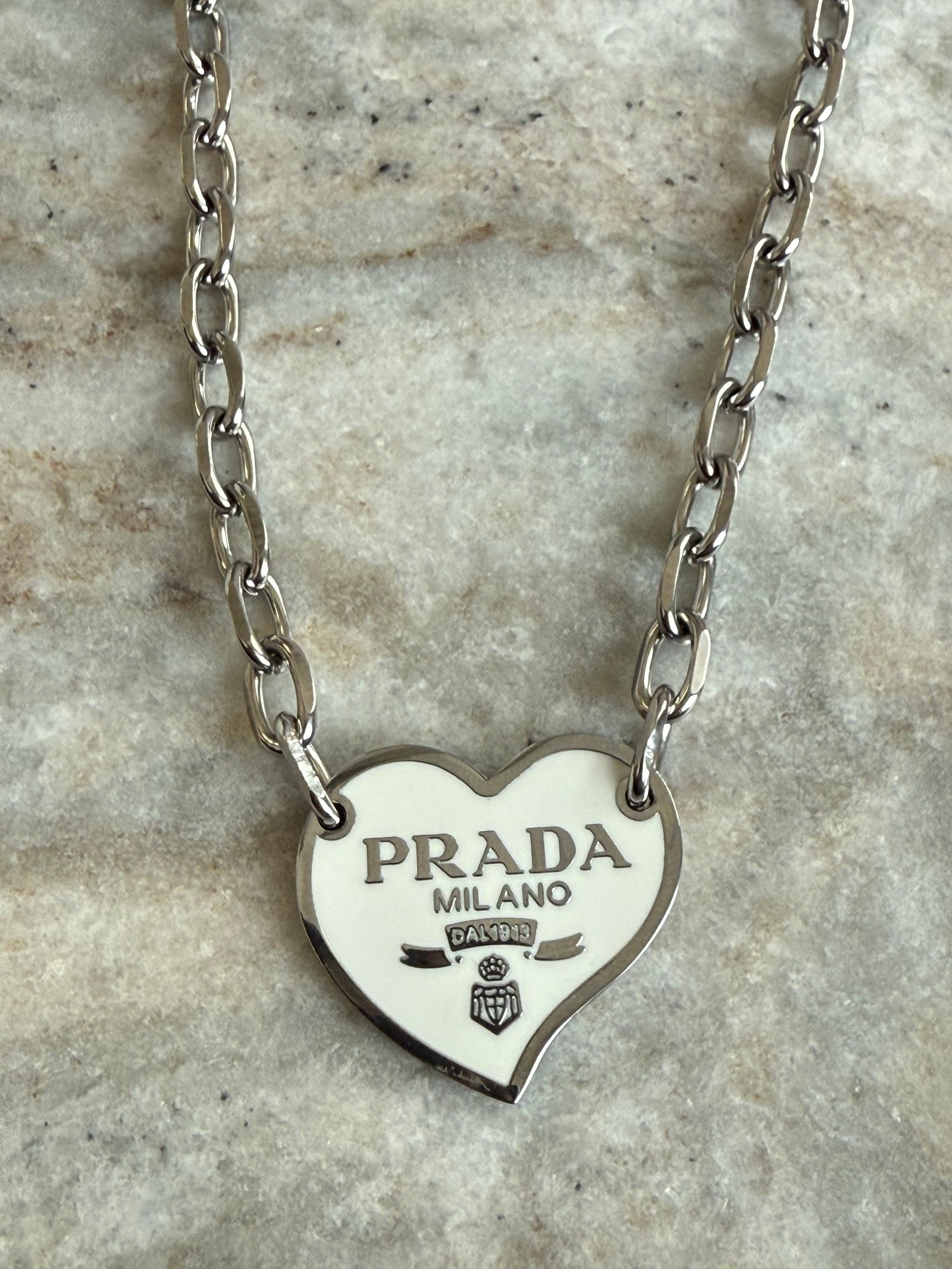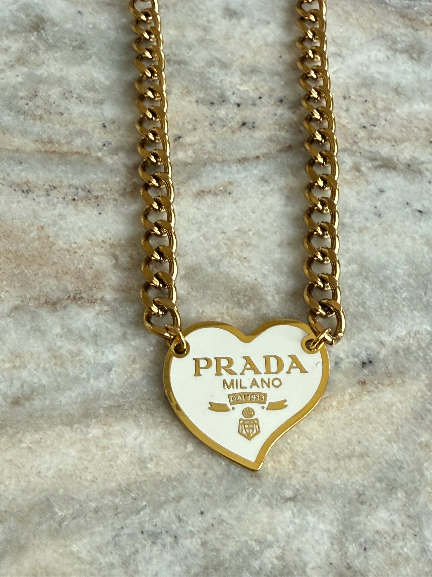 You’re looking at a piece we’ll probably never find again. This vintage Prada pendant was sourced from a rare drop and repurposed onto a non-tarnish 18k gold-filled chain that levels up everything.